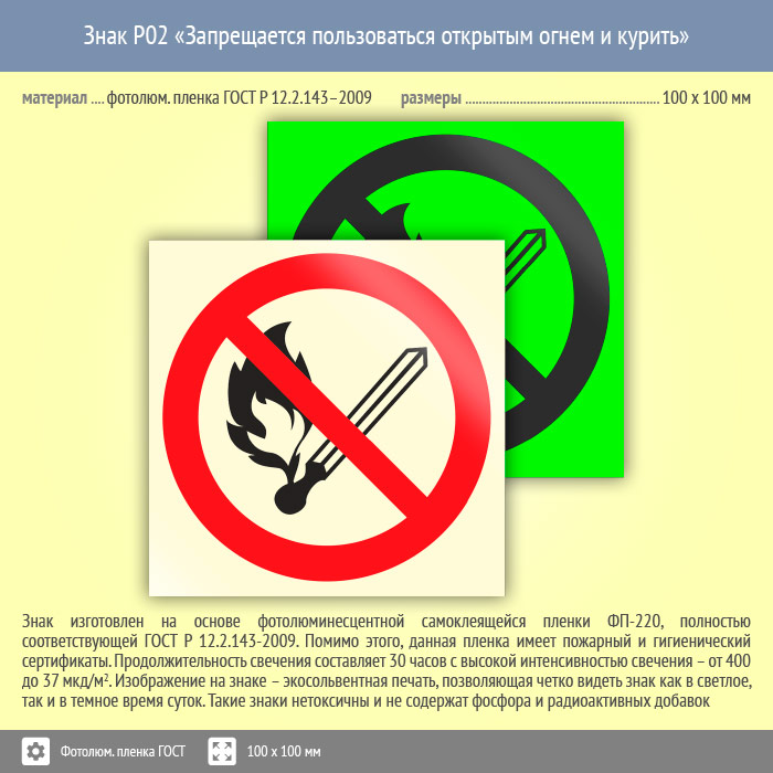 Знак P02 «Запрещается пользоваться открытым огнем и курить» (фотолюминесцентная пленка ГОСТ 34428-2018, 100х100 мм) в Ижевске купить