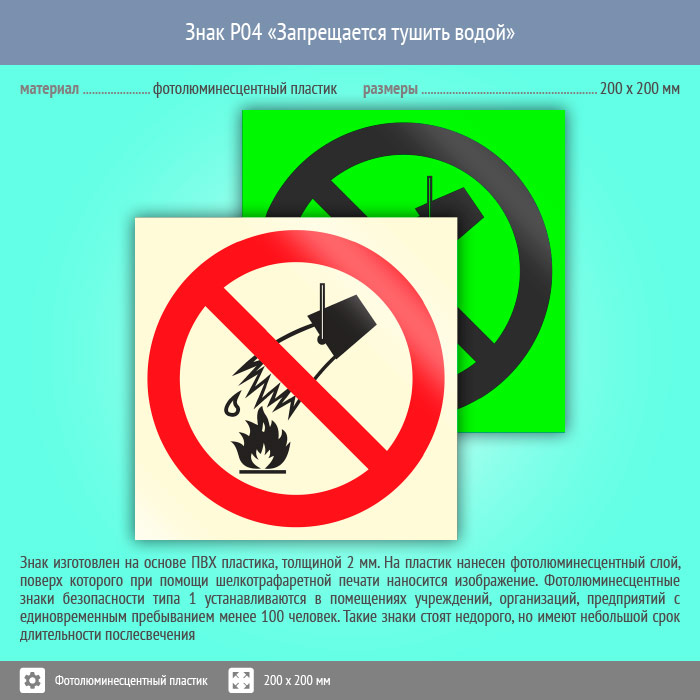 Знак P04 «Запрещается тушить водой» (фотолюминесцентный пластик, 200х200 мм) в Ижевске купить