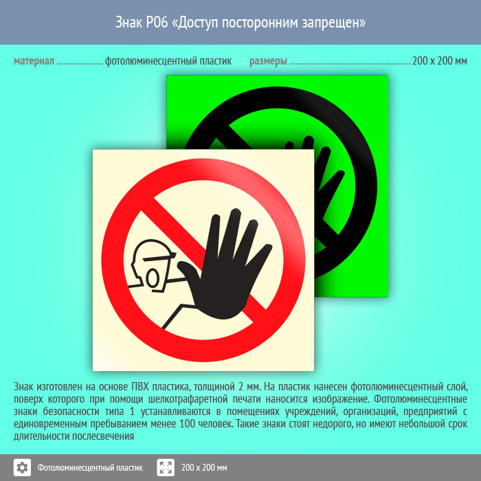 Знак P06 «Доступ посторонним запрещен» (фотолюминесцентный пластик, 200х200 мм) в Ижевске купить