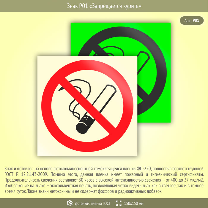 Знак P01 «Запрещается курить» (фотолюминесцентная пленка ГОСТ 34428-2018, 150х150 мм) в Ижевске купить
