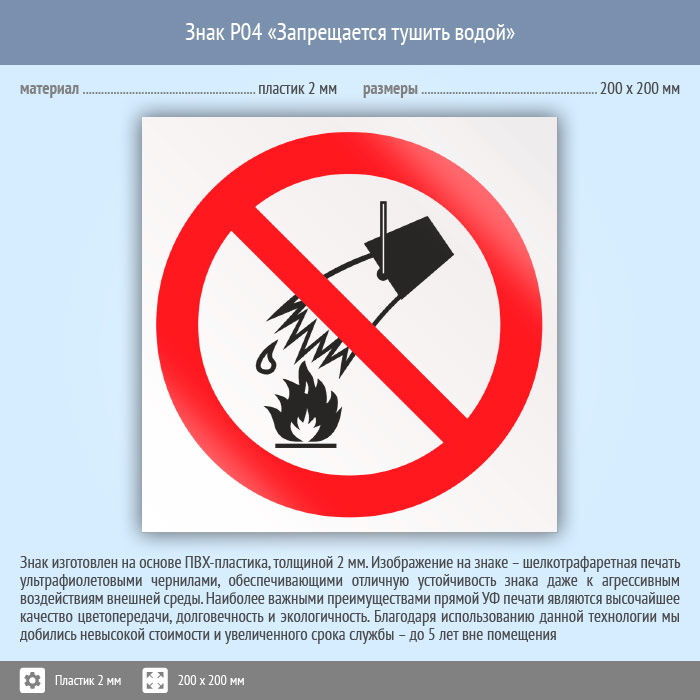 Знак P04 «Запрещается тушить водой» (пластик, 200х200 мм) в Ижевске купить