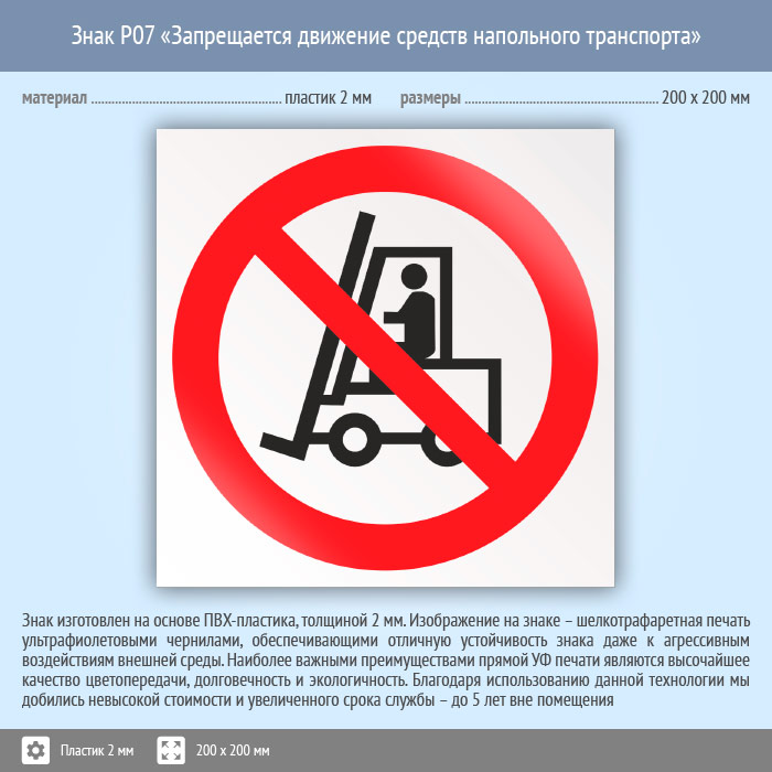 Знак P07 «Запрещается движение средств напольного транспорта» (пластик, 200х200 мм) в Ижевске купить