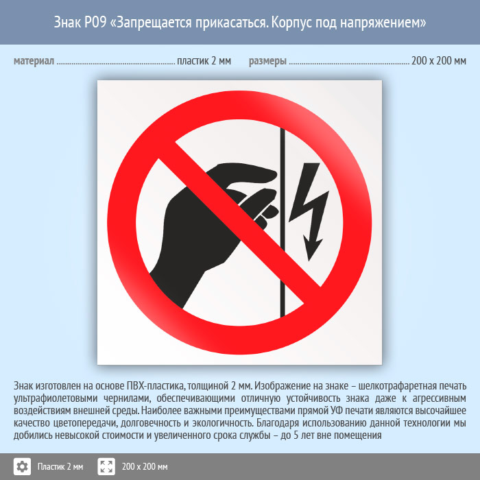 Знак P09 «Запрещается прикасаться. Корпус под напряжением» (пластик, 200х200 мм) в Ижевске купить