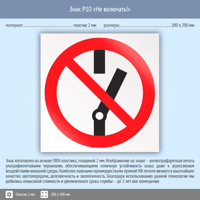 Знак P10 «Не включать!» (пластик, 200х200 мм) в Ижевске купить