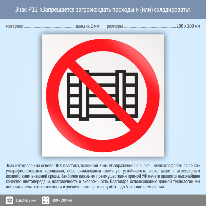 Знак P12 «Запрещается загромождать проходы и (или) складировать» (пластик, 200х200 мм) в Ижевске купить