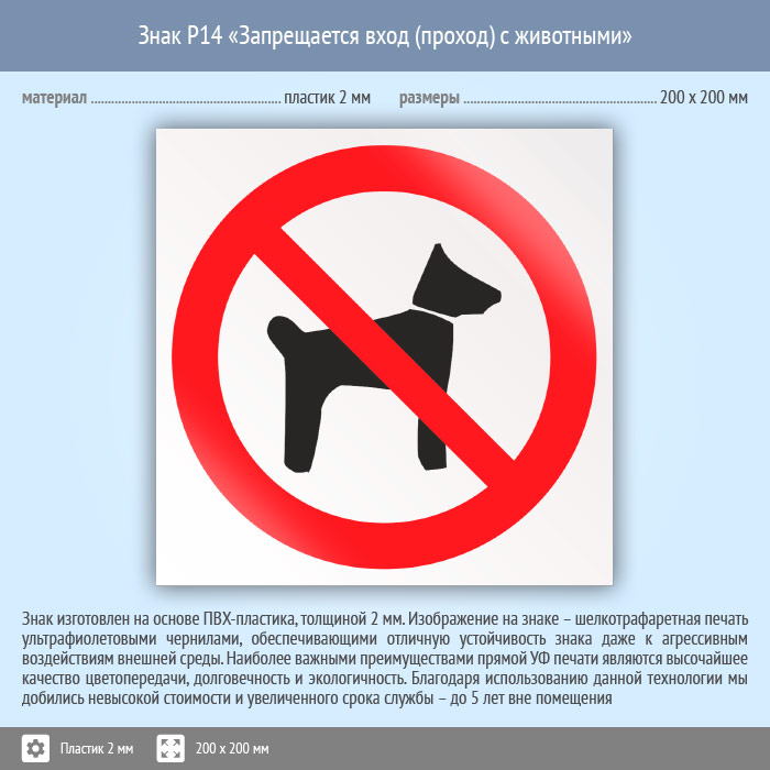 Знак P14 «Запрещается вход (проход) с животными» (пластик, 200х200 мм) в Ижевске купить