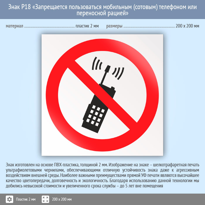 Знак P18 «Запрещается пользоваться мобильным (сотовым) телефоном или переносной рацией» (пластик, 200х200 мм) в Ижевске купить