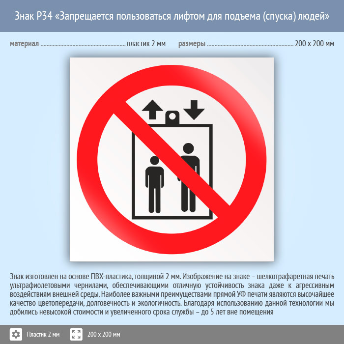 Знак P34 «Запрещается пользоваться лифтом для подъема (спуска) людей» (пластик, 200х200 мм) в Ижевске купить