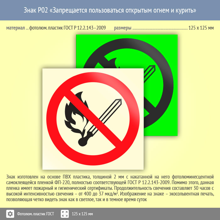 Знак P02 «Запрещается пользоваться открытым огнем и курить» (фотолюминесцентный пластик ГОСТ 34428-2018, 125х125 мм) в Ижевске купить