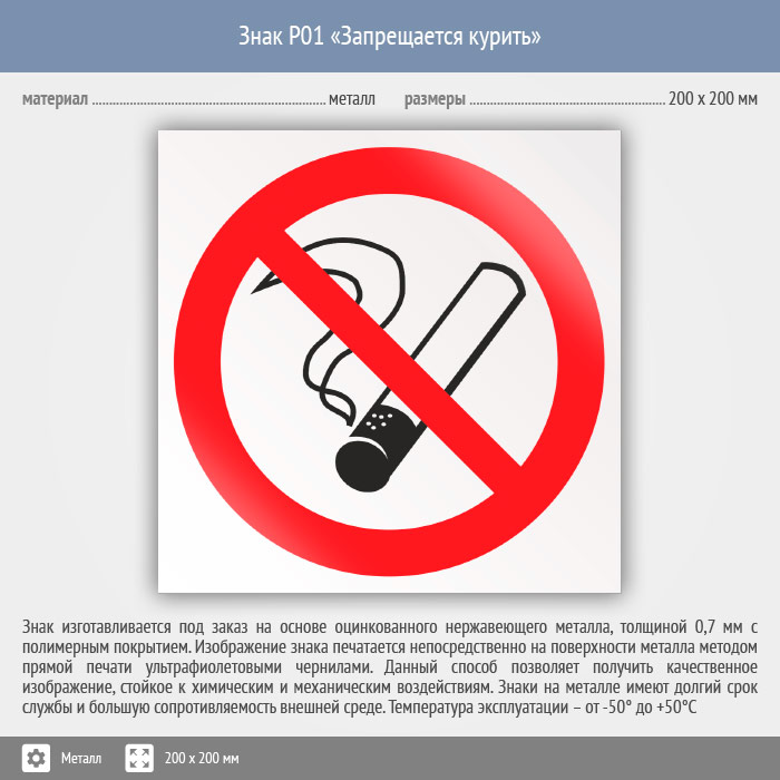 Знак P01 «Запрещается курить» (металл, 200х200 мм) в Ижевске купить