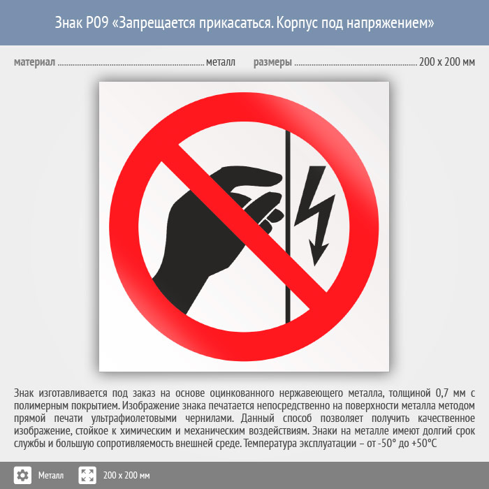 Знак P09 «Запрещается прикасаться. Корпус под напряжением» (металл, 200х200 мм) в Ижевске купить