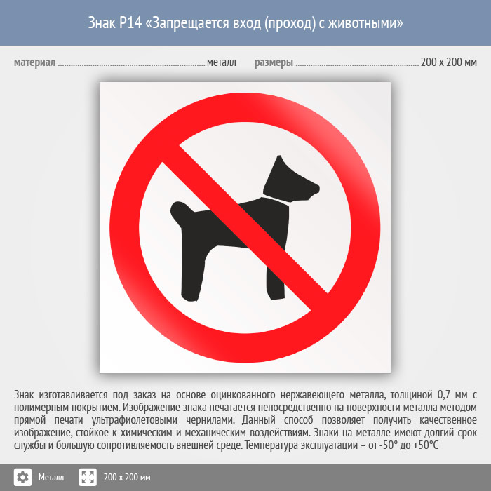 Знак P14 «Запрещается вход (проход) с животными» (металл, 200х200 мм) в Ижевске купить