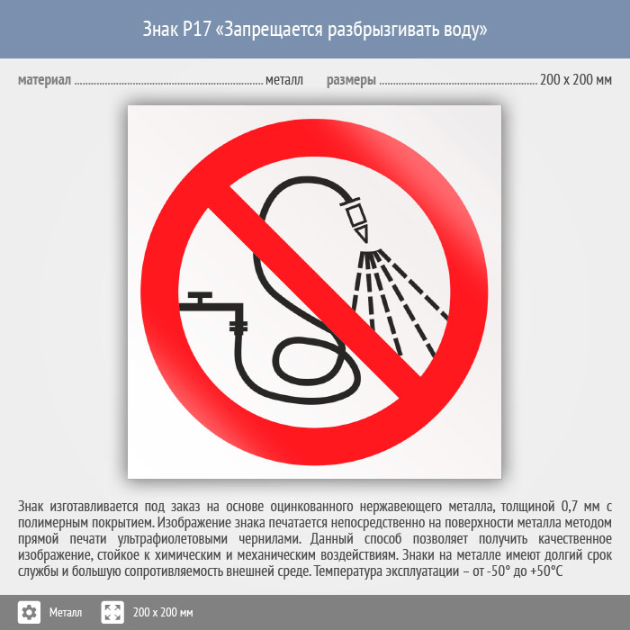 Знак P17 «Запрещается разбрызгивать воду» (металл, 200х200 мм) в Ижевске купить