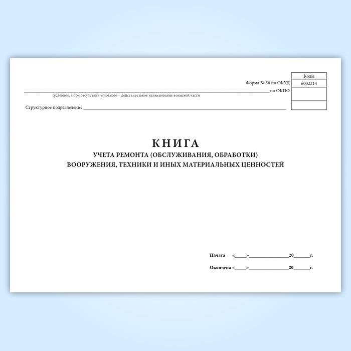Книга учета ремонта (обслуживания, обработки) вооружения, техники и иных материальных ценностей (форма 36) в Ижевске купить