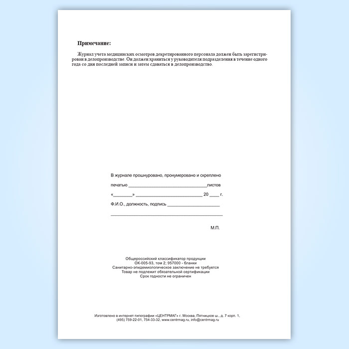 Журнал учета медицинских осмотров декретированного персонала в Ижевске купить