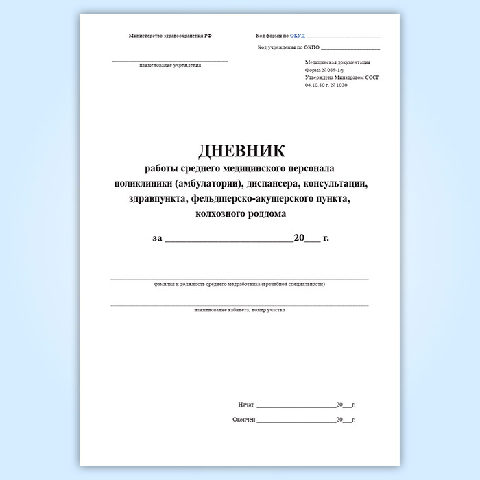Дневник работы среднего медицинского персонала поликлиники (амбулатории), диспансера, консультации, здравпункта, фельдшерско-акушерского пункта, колхозного роддома (форма 039-1/у) в Ижевске купить