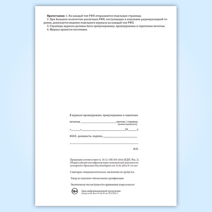 Приходно-расходный журнал учета радиофармпрепаратов, поступающих в подразделение радионуклидной терапии в готовом виде для непосредственного введения в организм пациента в Ижевске купить