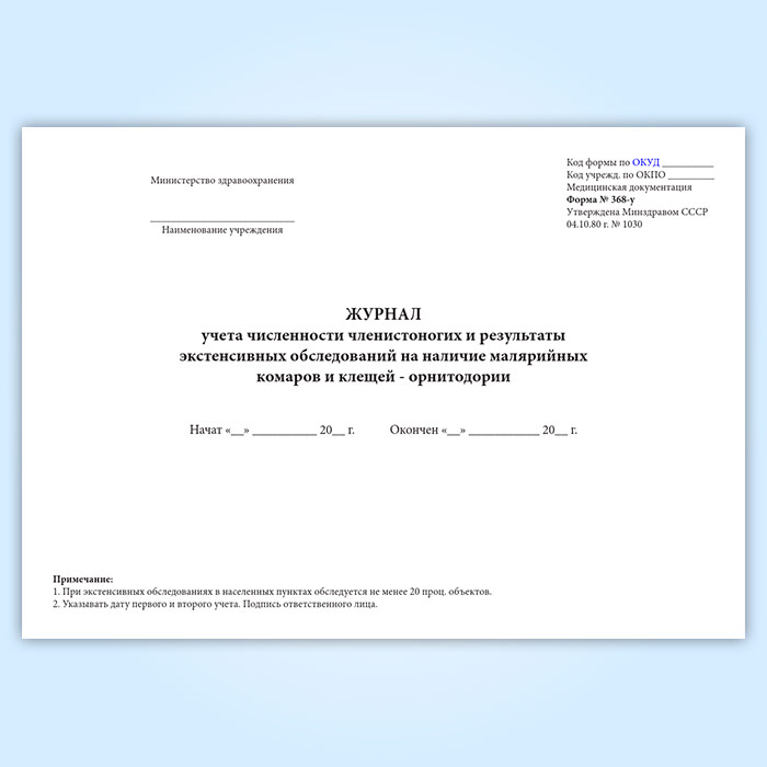 Журнал учета численности членистоногих и результаты экстенсивных обследований на наличие малярийных комаров и клещей - орнитодории (форма № 368-у) в Ижевске купить