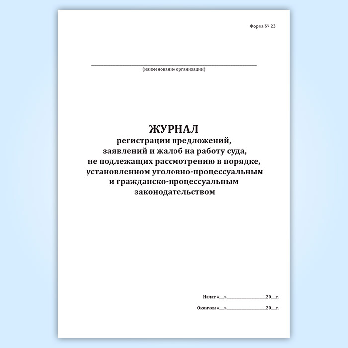 Журнал регистрации предложений, заявлений и жалоб на работу суда, не подлежащих рассмотрению в порядке, установленном уголовно-процессуальным и гражданско-процессуальным законодательством (форма № 23) в Ижевске купить