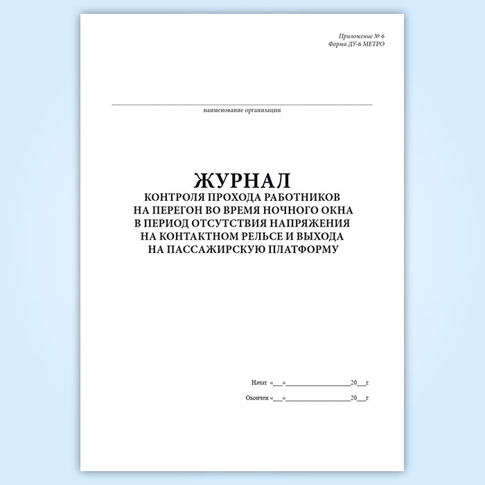Журнал контроля прохода работников на перегон во время ночного окна в период отсутствия напряжения на контактном рельсе и выхода на пассажирскую платформу (форма ДУ-6 МЕТРО) в Ижевске купить