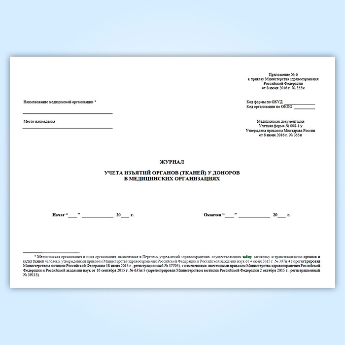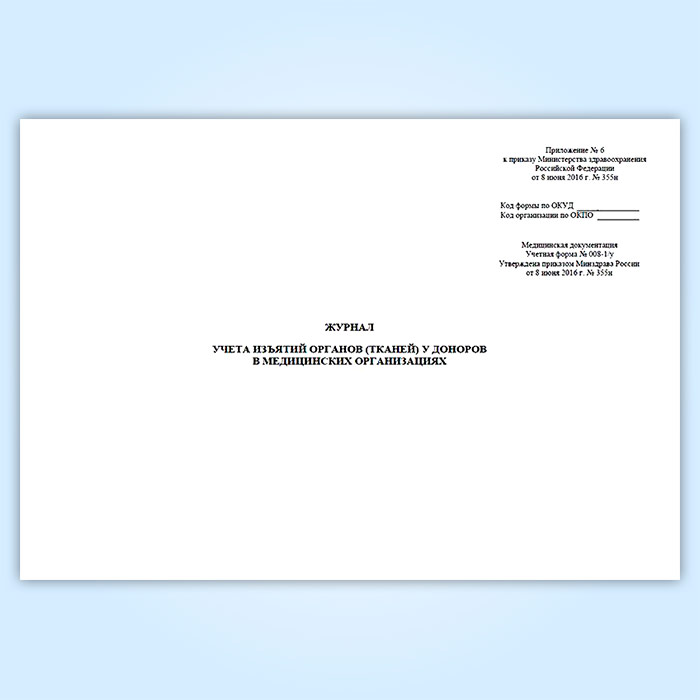 Журнал учета изъятий органов (тканей) у доноров в медицинских организациях (форма № 008-1/у) в Ижевске купить