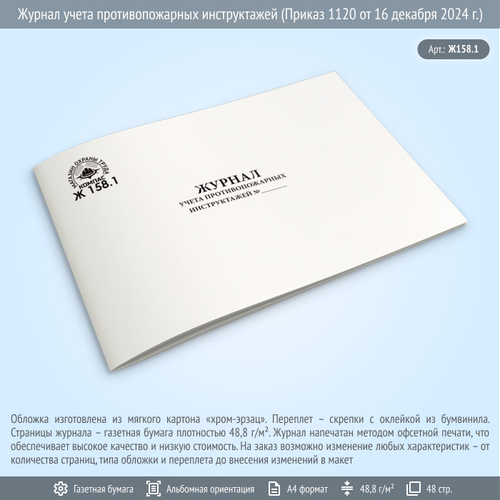 Журнал учета противопожарных инструктажей (Приказ 1120 от 16 декабря 2024 г.) (48 стр., Ж158.1) в Ижевске купить