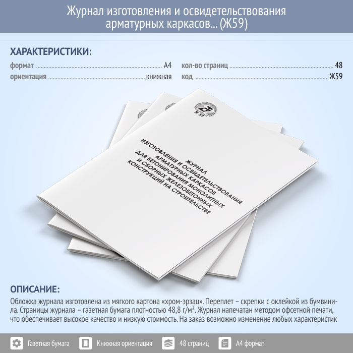 Журнал изготовления и освидетельствования арматурных каркасов для бетонирования монолитных и сборных железобетонных конструкций на строительстве (Ф-48) (48 стр., Ж59) в Ижевске купить