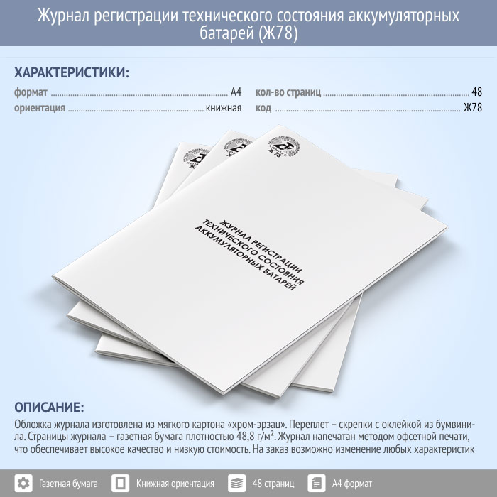 Журнал регистрации технического состояния аккумуляторных батарей (48 стр., Ж78) в Ижевске купить