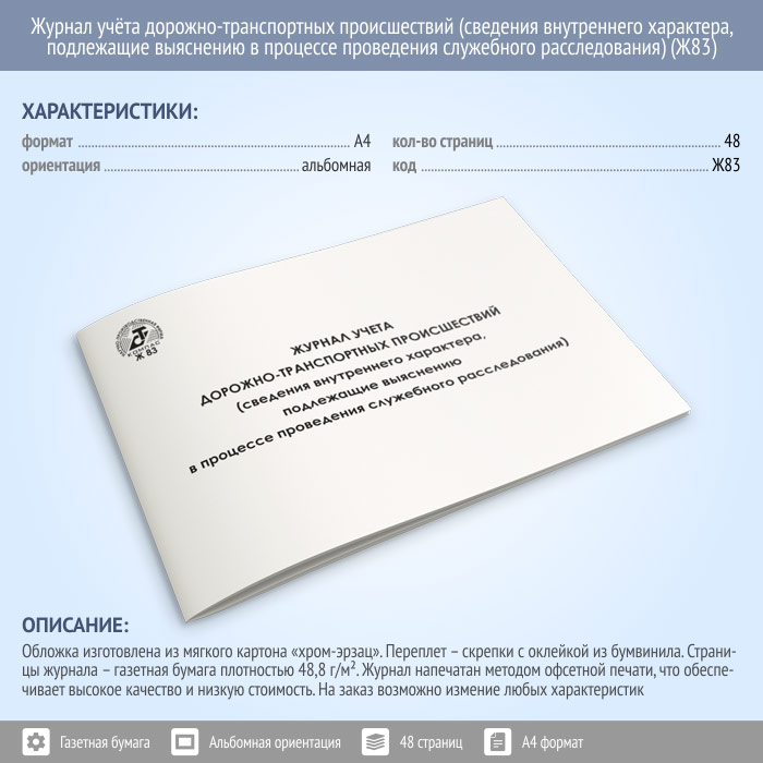 Журнал учета дорожно-транспортных происшествий (сведения внутреннего характера, подлежащие выяснению в процессе проведения служебного расследования) (48 стр., Ж83) в Ижевске купить