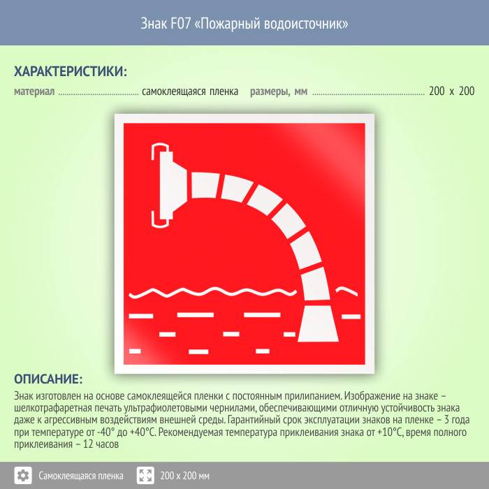 Знак F07 «Пожарный водоисточник» (фотолюм. пленка, 200х200 мм)