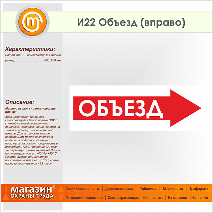 Знак «Объезд (вправо)» может быть изготовлен любого размера на самоклеящейся пленке, пластике толщиной 0.5, 2 или 4 мм и металле. Также возможно применение фотолюминесцентных и световозвращающих материалов