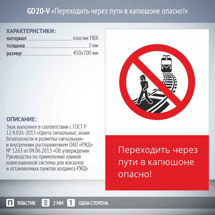 Знак безопасности «Переходить через пути в капюшоне опасно!» выполняется в одностороннем (металл и пластик) и двустороннем (только металл) виде на ПВХ-пластике, толщиной 2 мм или на листе оцинкованного металла, толщиной 0,8 мм. Размеры знаков - 450 мм х 700 мм (вертикальная ориентация) либо 540 мм х 220 мм (горизонтальная ориентация). Знаки изготавливаются в полном соответствии с ГОСТ Р 12.4.026-2015 «Цвета сигнальные, знаки безопасности и разметка сигнальная» и внутренним распоряжением ОАО «РЖД» № 1263 от 04.06.2013 «Об утверждении Руководства по применению единой навигационной системы для вокзалов и остановочных пунктов холдинга РЖД». По желанию заказчика возможно использование светоотражающих материалов. Так же при необходимости производим закругление углов знака
