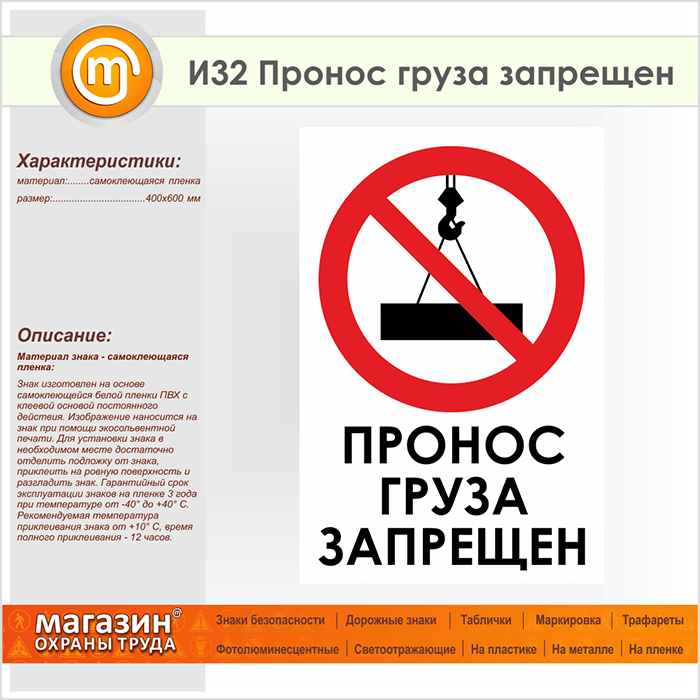Табличка «Пронос груза запрещен» обозначает, что в данном месте (или над данным местом) груз проносить строго запрещено. Код знака: И32