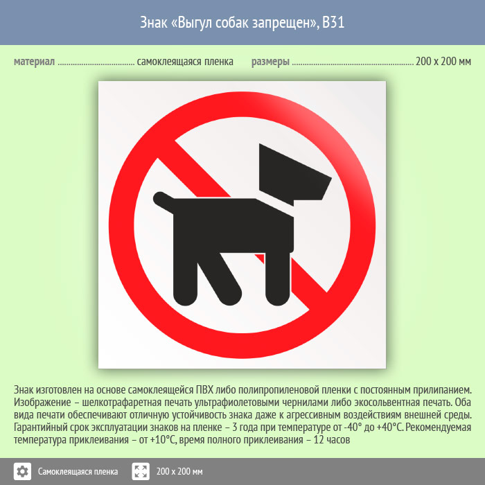 Знак «Выгул собак запрещен» может быть изготовлен любого размера на самоклеящейся пленке, пластике толщиной 0.5, 2 или 4 мм и металле. Также возможно применение фотолюминесцентных и световозвращающих материалов