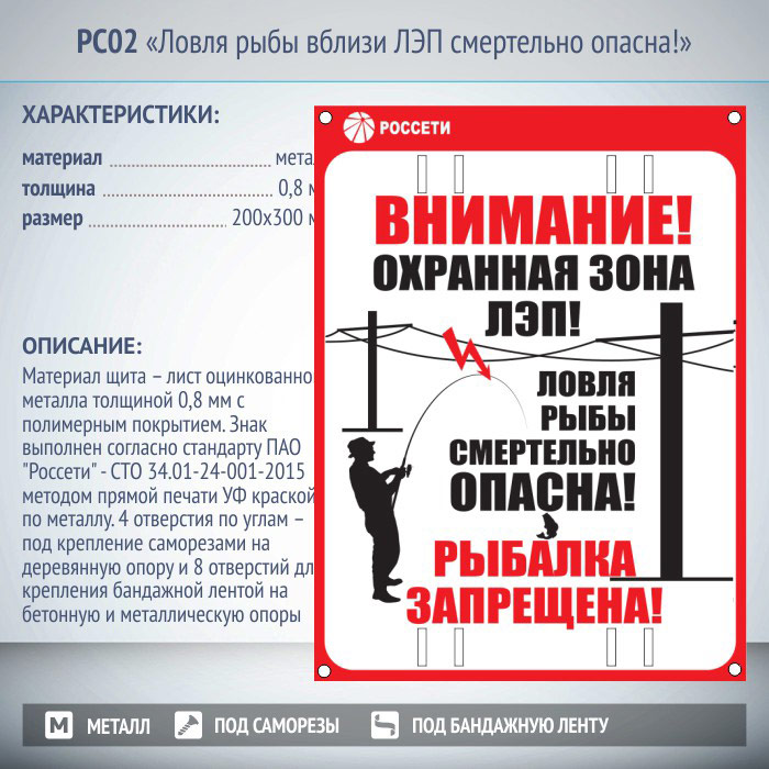 Знак «Ловля рыбы вблизи ЛЭП смертельно опасна!», РС02 (металл, 200х300 мм, отверстия под бандажную ленту) в Ижевске купить