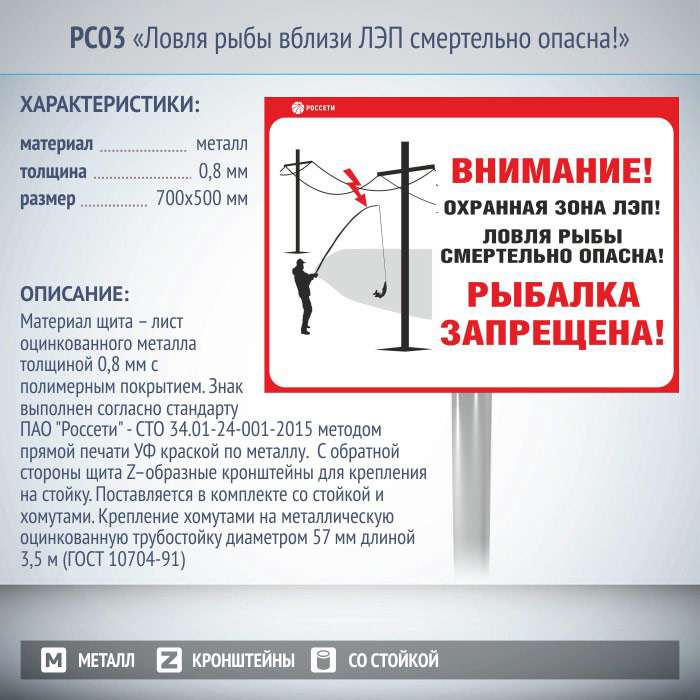 Информационный щит «Ловля рыбы вблизи ЛЭП смертельно опасна!», РС03 (металл, 700х500 мм, с металлической стойкой) в Ижевске купить