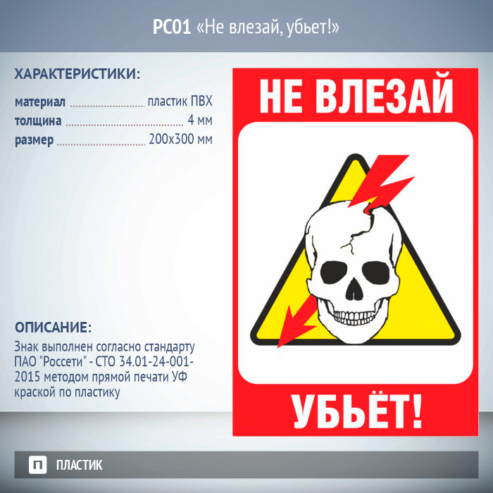 Знак «Не влезай, убьет!», РС01 (пластик 2 мм, 200х300 мм) в Ижевске купить