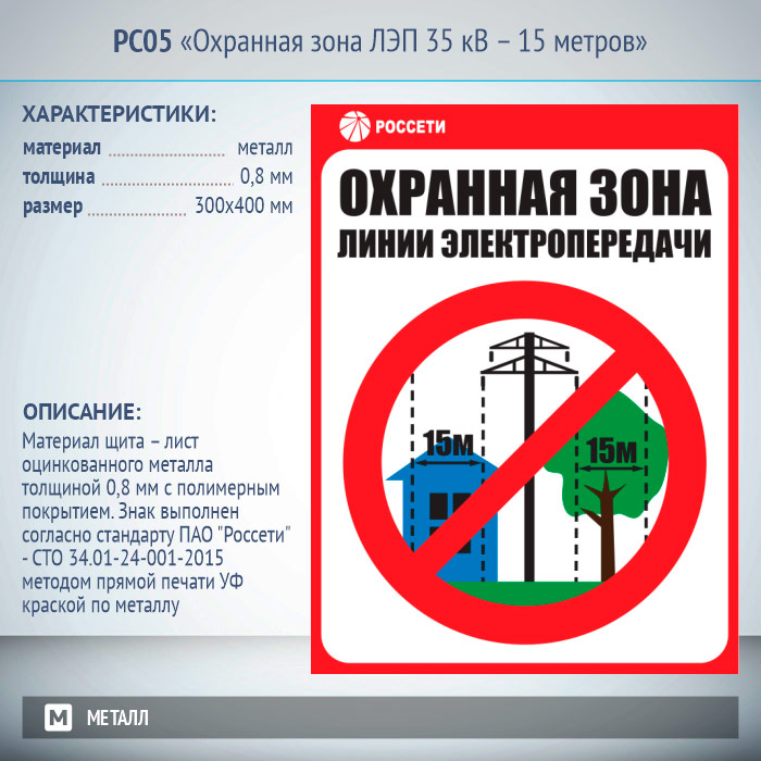 Знак «Охранная зона ЛЭП 35 кВ – 15 метров», РС05 (металл, 300х400 мм) в Ижевске купить