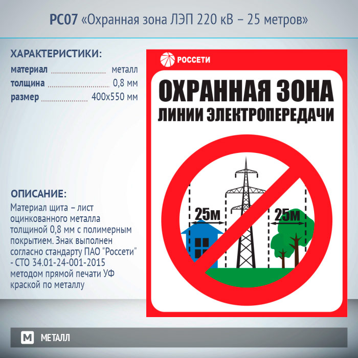 Знак «Охранная зона ЛЭП 220 кВ – 25 метров», РС07 (металл, 400х550 мм) в Ижевске купить