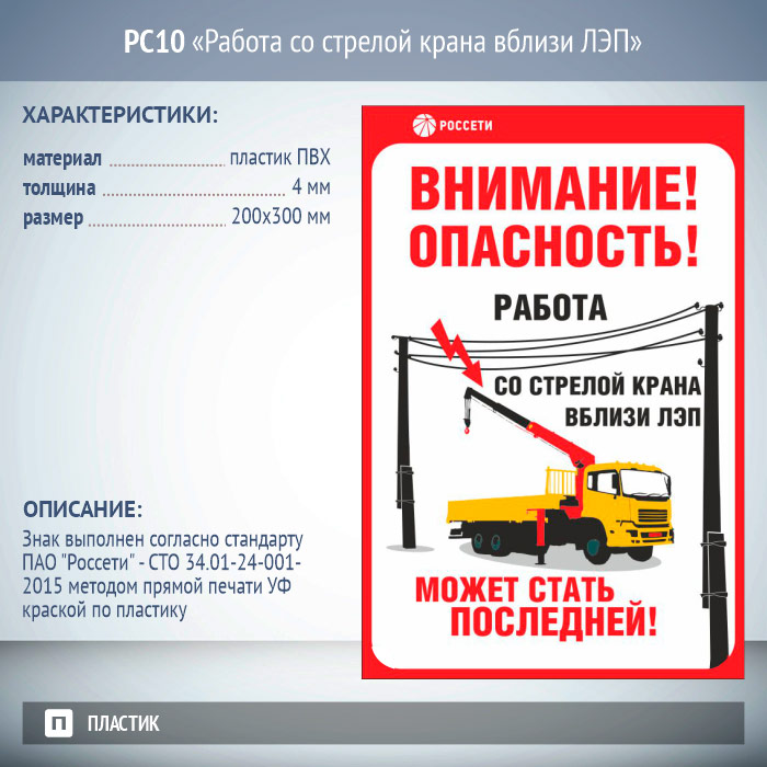 Знак «Работа со стрелой крана вблизи ЛЭП», РС10 (пластик 2 мм, 200х300 мм) в Ижевске купить