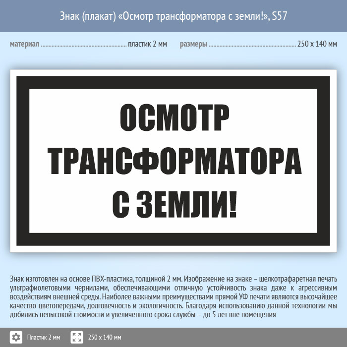 Знак (плакат) «Осмотр трансформатора с земли!», S57 (пластик, 250х140 мм) в Ижевске купить