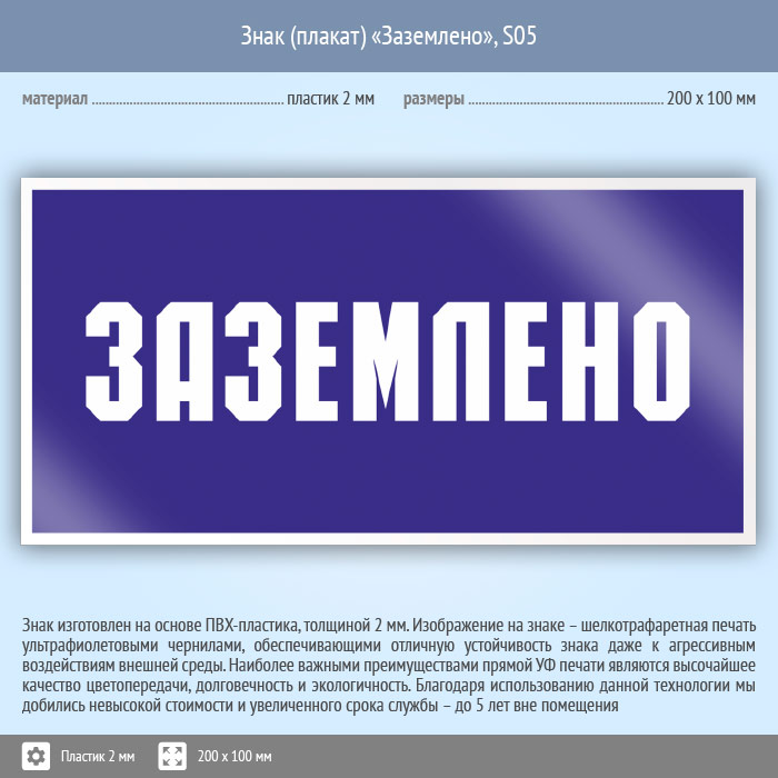 Знак (плакат) «Заземлено», S05 (пластик, 200х100 мм) в Ижевске купить