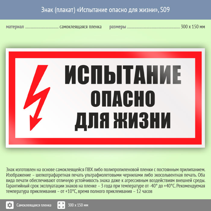 Знак (плакат) «Испытание опасно для жизни», S09 (пленка, 300х150 мм) в Ижевске купить