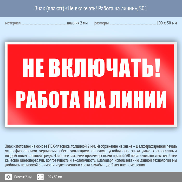 Знак (плакат) «Не включать! Работа на линии», S01 (пластик, 100х50 мм) в Ижевске купить