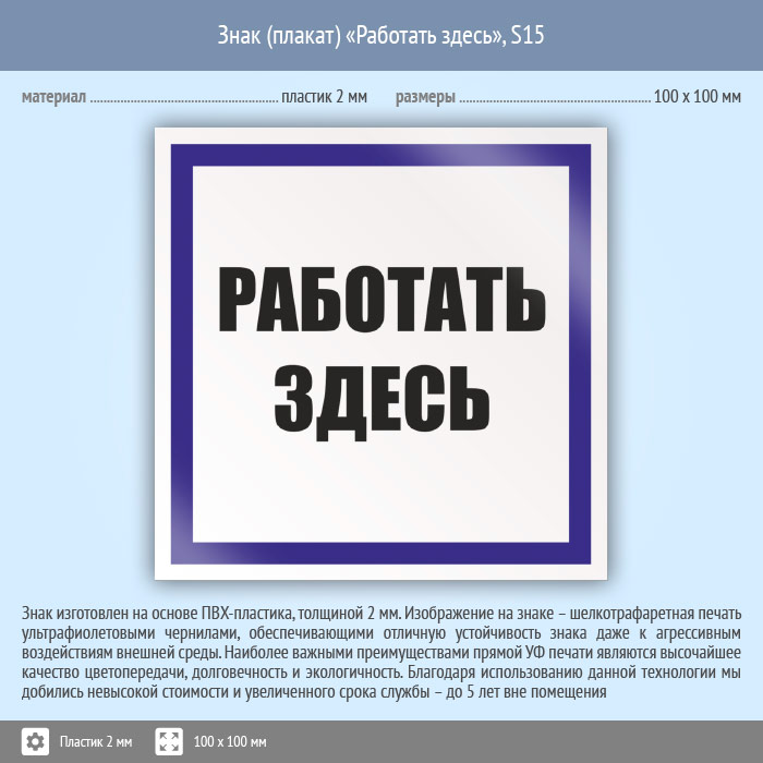 Знак (плакат) «Работать здесь», S15 (пластик, 100х100 мм) в Ижевске купить
