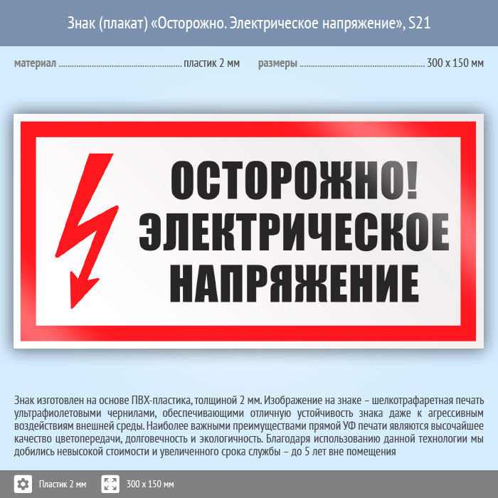 Знак (плакат) «Осторожно. Электрическое напряжение», S21 (пластик, 300х150 мм) в Ижевске купить