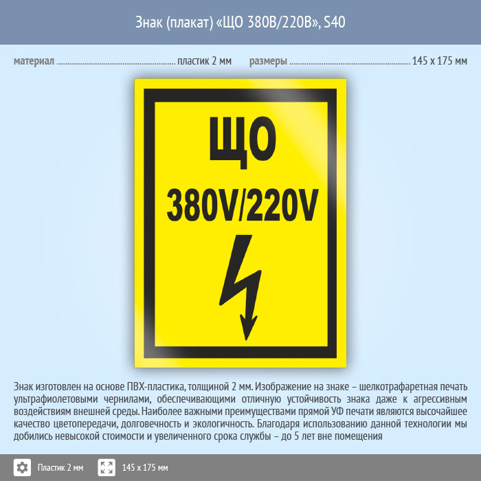 Знак (плакат) «ЩО 380В/220В», S40 (пластик, 145х175 мм) в Ижевске купить