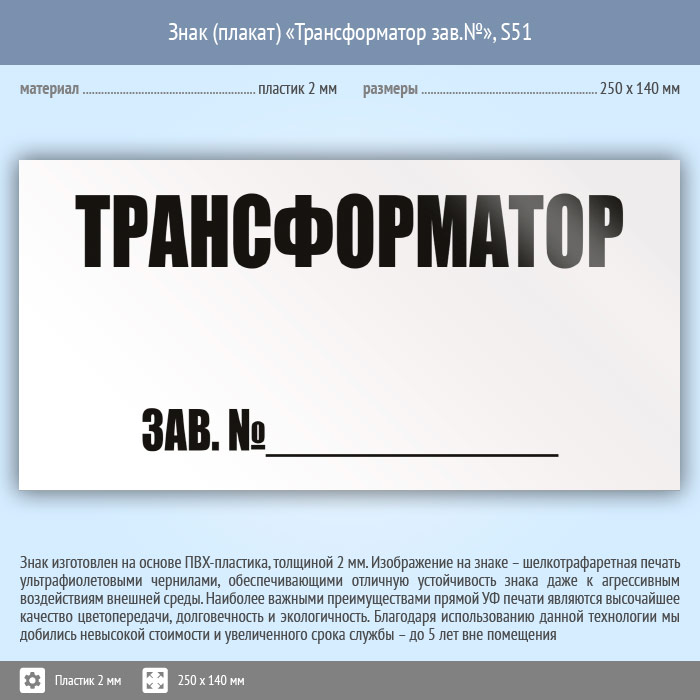 Знак (плакат) «Трансформатор зав.№», S51 (пластик, 250х140 мм) в Ижевске купить