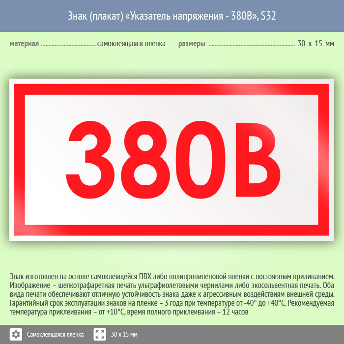 Знак (плакат) «Указатель напряжения - 380В», S32 (50 штук, пленка, 30х15 мм) в Ижевске купить