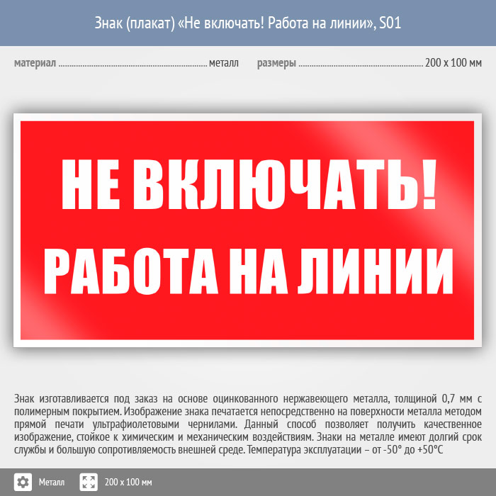 Знак (плакат) «Не включать! Работа на линии», S01 (металл, 200х100 мм) в Ижевске купить